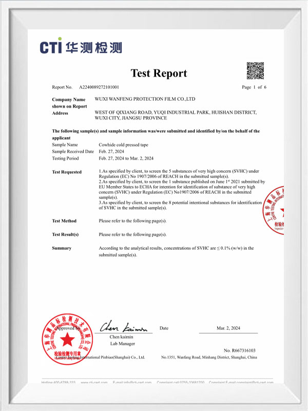 Enkel applicering och borttagning: En annan betydande fördel med Cowhide Cold Pressing Tape är dess enkla applicering och borttagning. Tejpen kan appliceras snabbt och effektivt, vilket kräver minimal förberedelse eller speciella tekniker. Dessutom, när det är dags att ta bort tejpen, lossnar den rent utan att lämna kvar några klibbiga rester. Denna funktion är särskilt fördelaktig i applikationer där tejpen behöver tas bort eller flyttas utan att skada den underliggande ytan. Wuxi Wanfeng Protective Film Co., Ltd. har konstruerat tejpen för att ge en enkel ansökningsprocess samtidigt som den säkerställer att borttagningen är problemfri.