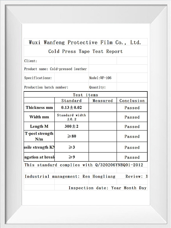 Kallpressapplikation: Som namnet antyder är Cowhide Cold Pressing Tape designad för användning i kallpressapplikationer. Till skillnad från andra självhäftande tejper som kräver värmeaktivering kan denna tejp uppnå stark vidhäftning vid rumstemperatur. Denna funktion förenklar appliceringsprocessen och minskar behovet av ytterligare utrustning eller värmeelement. Möjligheten att prestera effektivt utan värme gör Cowhide Cold Pressing Tape till ett kostnadseffektivt och användarvänligt alternativ för olika industrier. Wuxi Wanfeng Protective Film Co., Ltd. har utvecklat denna tejp för att utmärka sig i kallpressscenarier, vilket ger en praktisk lösning för tillverkare och monteringslinjer.